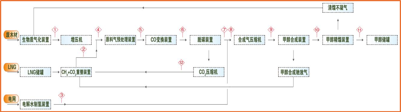 20000吨/年绿色甲醇项目,采用生物气化、甲烷+CO2重整、电解水制氢等工艺制取甲醇合成所需的CO、H2、CO2的原料气,原料气经过一系列的单元处理后, 采用一氧化碳加氢的方式合成甲醇,合成的甲醇用于船舶燃料或化学原料。